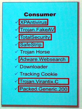 2009年の主流となったのは、ユーザーの恐怖心を煽る偽セキュリティ対策ソフト。同氏が紹介した1例は、クリーンなWindowsにインストールしたにもかかわらず、ウイルス検知のアラートを大量に表示する偽セキュリティ対策ソフトの「AntiVirus XP 2008」で、正規版の導入を迫るという。