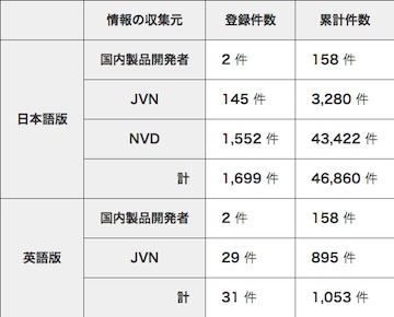 2014年第2四半期末時点での累計登録件数は4万6860件。前四半期の1790件件を下回るものの、1699件の情報が同四半期に追加された。内訳を見ると、国内製品開発者による情報が2件、JVNの掲載情報が145件、NVDの情報が1552件。前四半期と比較すると、JVNの掲載情報が119件減と目立った動きを見せた。