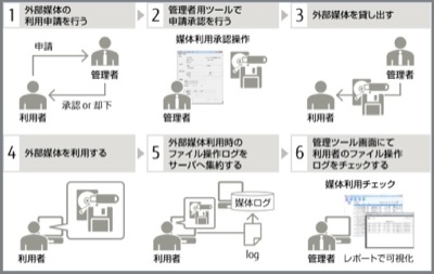 また、「外部記録媒体管理ワークフロー機能」を用意。従業員による外部記録メディアの利用申請に対し、必要に応じて管理者が許可できる。さらに持ち出すデータに対して、強制的に暗号化でき、紛失時における情報漏洩を防止する。
