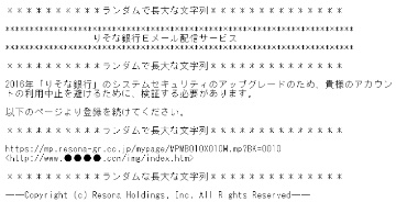 同協議会によれば、偽サイトへ誘導するフィッシングメールは、少なくとも3種類の件名が確認されている。日付が挿入されている「りそな銀行重要なお知らせ(2016年8月27日更新)」をはじめ、「りそな銀行メールアドレスの確認」「りそな銀行本人認証サービス」といったタイトルが利用されていた。
