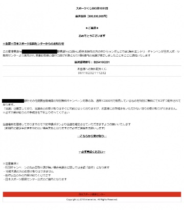 日本スポーツ振興センターをかたり、「スポーツくじBIGの無料エントリーキャンペーンで1等6億円の当選が確定した」などとだますフィッシングメールが確認されたもの。同センターが注意を喚起した。