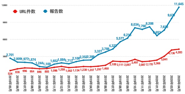 4月の偽サイトURL件数、過去最多を更新 - 報告も1.1万件超に