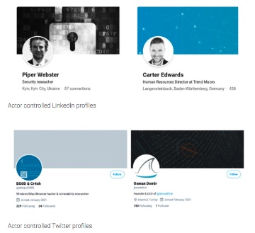 さらに「Twitter」や「LinkedIn」では、企業アカウントにくわえて、同社関係者を装ったアカウントも展開。実在するセキュリティ企業へ転職したことを装うアカウントもあった。確認されたアカウントはいずれも閉鎖されている。