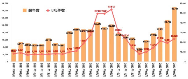 6月のフィッシング報告件数は前月から約31.6%増加し、過去最多を更新した。悪用されたURLの件数も前月より増加している。