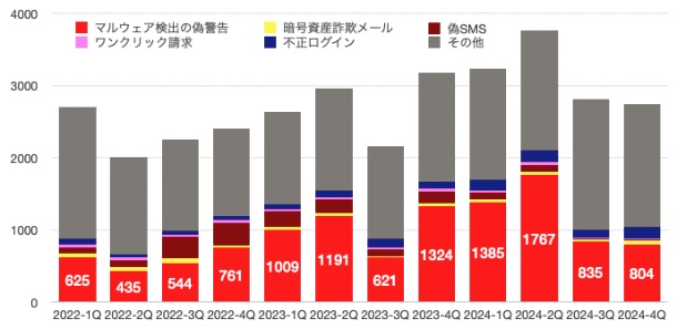 「マルウェアを検出した」などと偽の警告画面で不安を煽り、「サポート窓口」を装って金銭をだまし取ったり、端末を侵害する「偽警告」の相談は804件。前四半期から3.7%減少するものの、引き続き多くの相談が寄せられた。