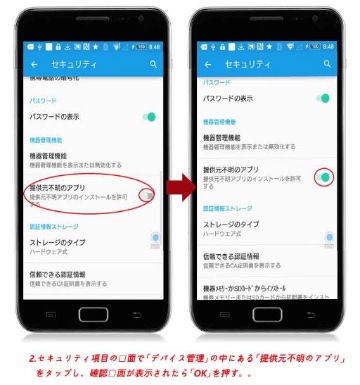 SMSによる誘導先。提供元不明のアプリをインストールできるよう設定変更するよう求めていた